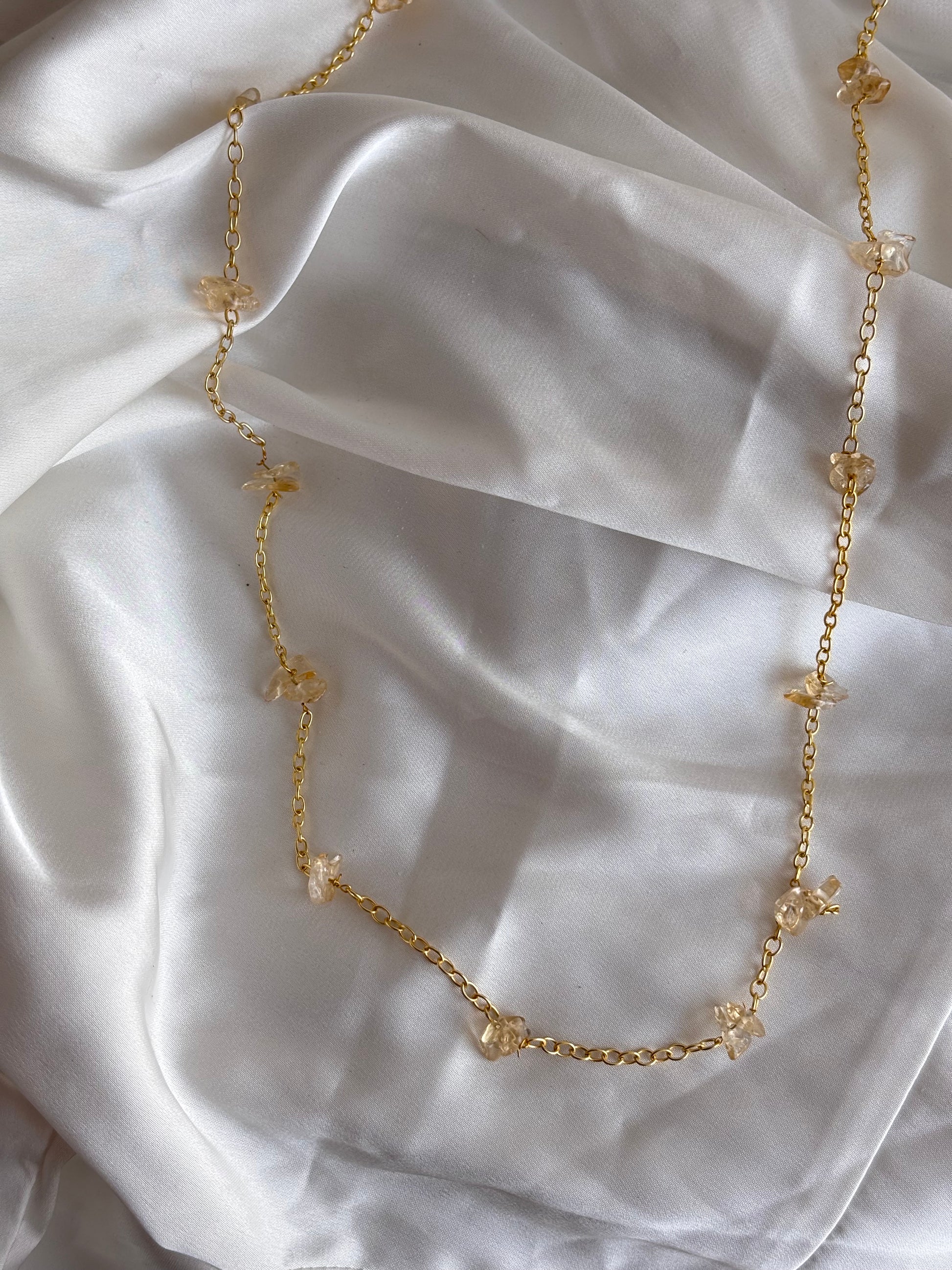 Dress up your neckline with this stunning long necklace featuring raw citrine stones. The premium brass chain is lightweight, comfortable, and built to last. Pair with other necklaces or wear it solo for a versatile look.