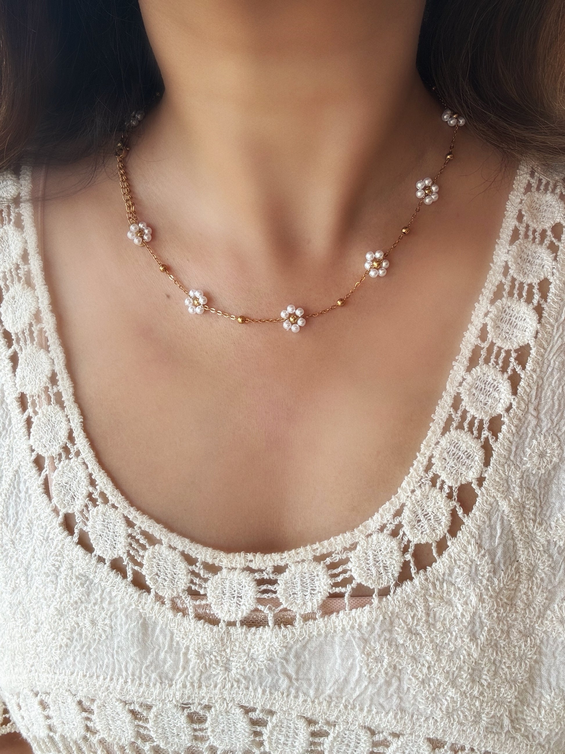 Fresh as daisies, these tiny pearl flowers come together to make a dainty necklace that adds freshness and elegance to any look. Wear it as a choker one one day or a short necklace on the other - it's adjustable!