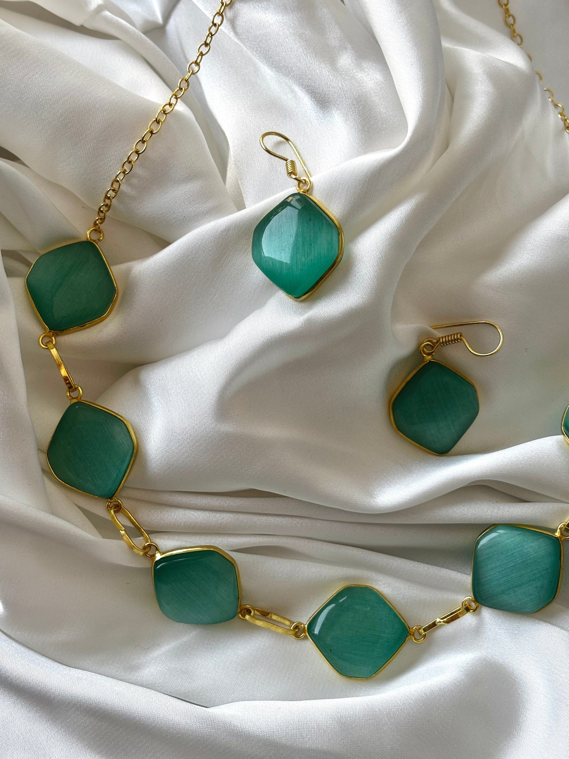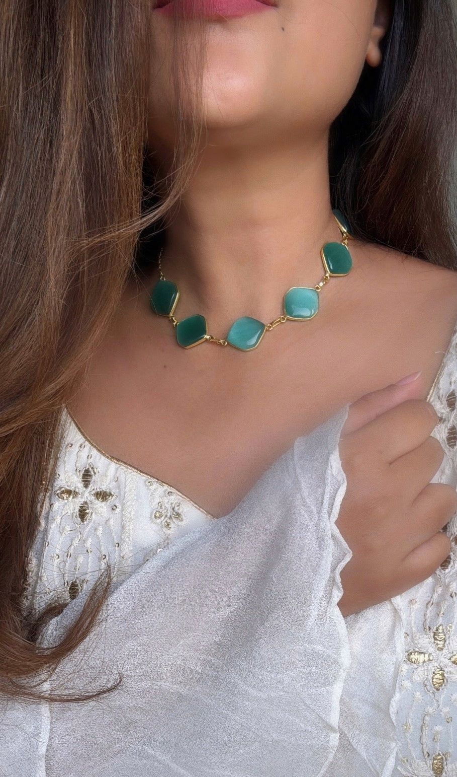 Set of sea green stones embedded in a handcrafted necklace and matching earrings, a perfect addition to your Indian outfits or evening gown/ dresses!