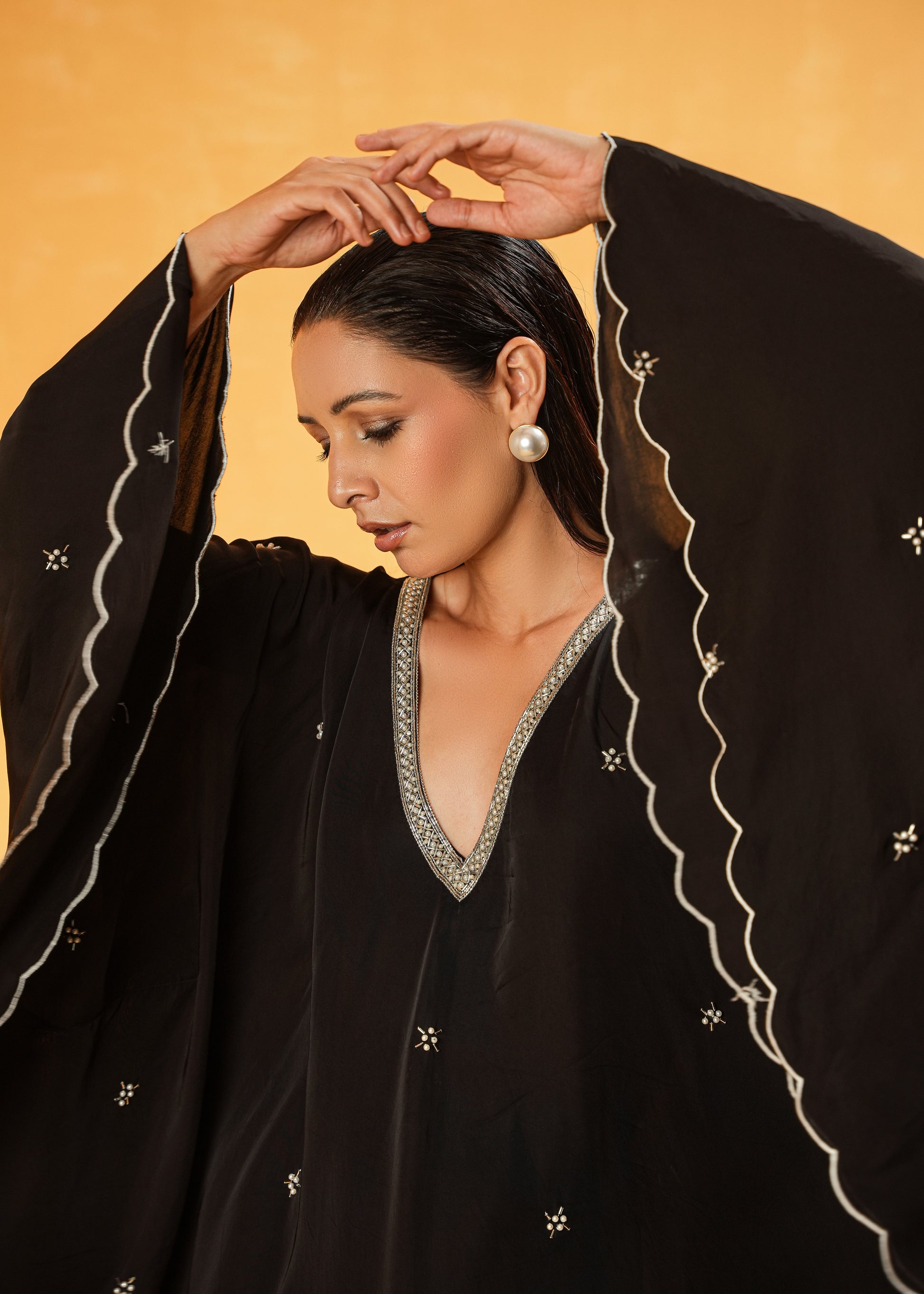 This classic pearl-shaped stud features a stunning gold casing, evoking a 'old money' aesthetic A lightweight, comfortable and chic essential for any fashionable ensemble - Indian or Modern!