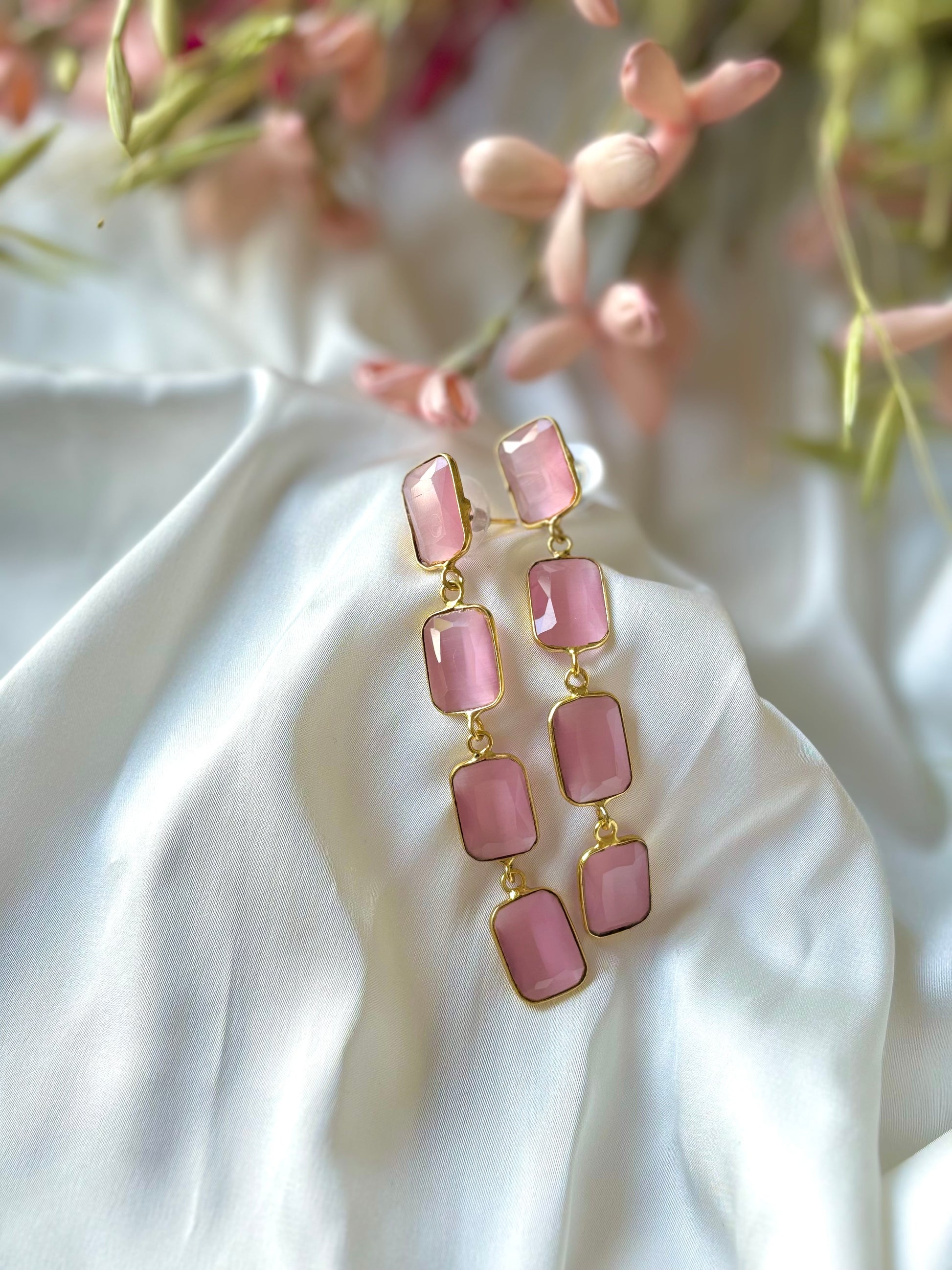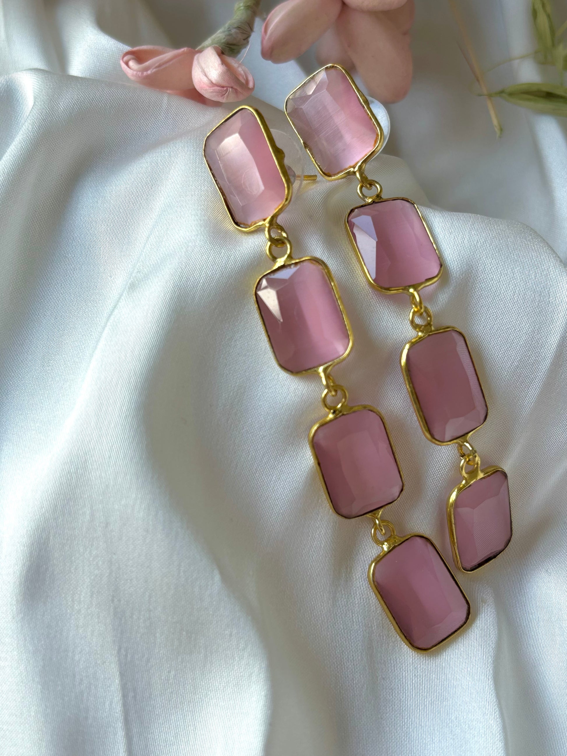 Stunningly hued gemstone dangler earrings in two delectable hues - emerald and rose quartz. Exquisitely crafted, they dangle gracefully and enhance the shape and balance of your face. In other words - universally flattering! Skillfully handmade for optimal perfection.