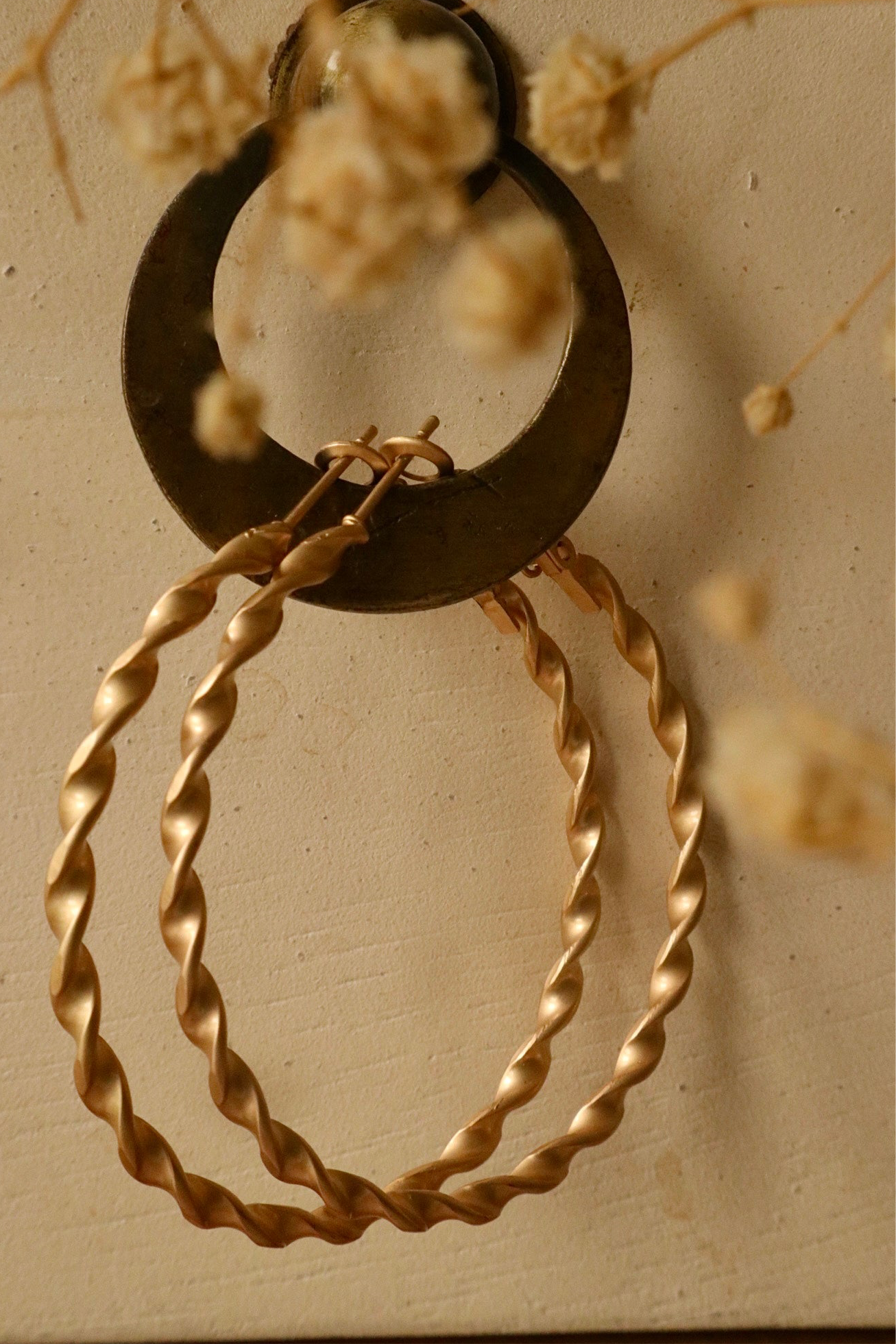 Hoops, but better! These unique hoops feature intricate twists in a sleek matte gold finish, adding a touch of chic sophistication to any outfit. Whether it's for a fancy event or a casual day out, these earrings are the perfect versatile accessory for your style.