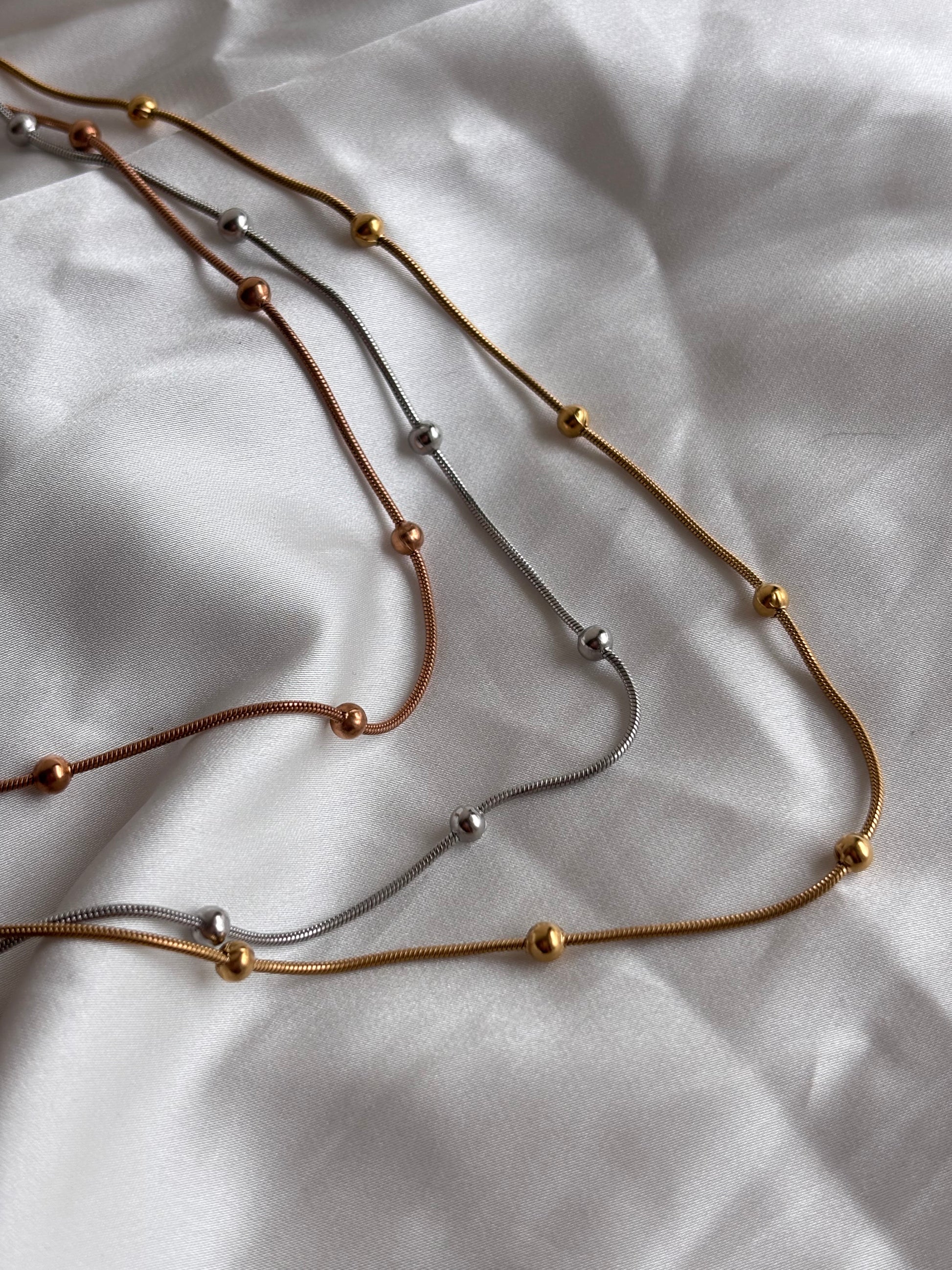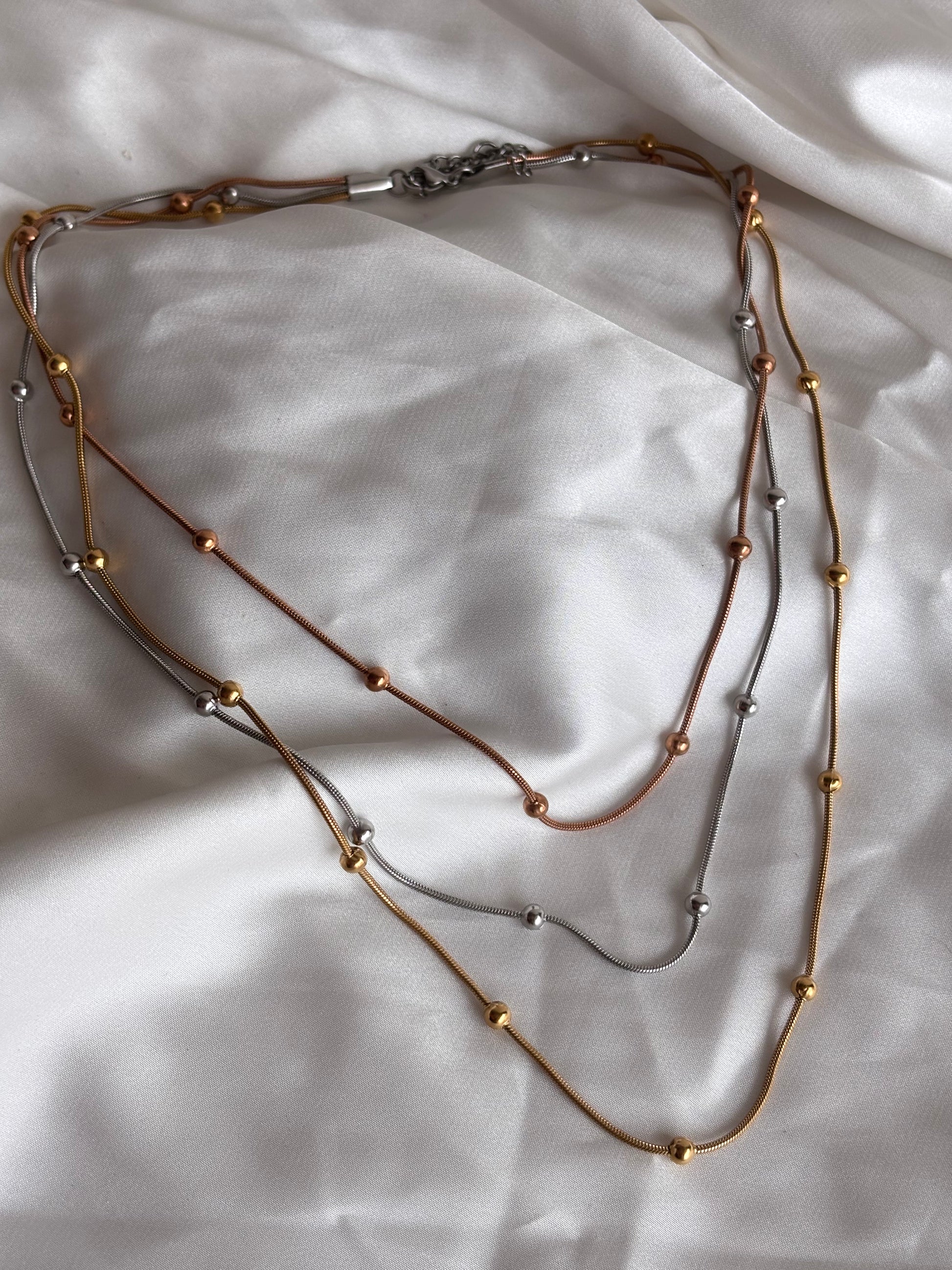 Sleek. Sharp. Sexy. - The trifecta of colours is a mixed metal triple-layer chain designed for the one who doesn’t pick sides. Featuring silver, gold, and rose gold tones in fluid contrast, each layer moves with a different rhythm — but together, they speak one bold language.